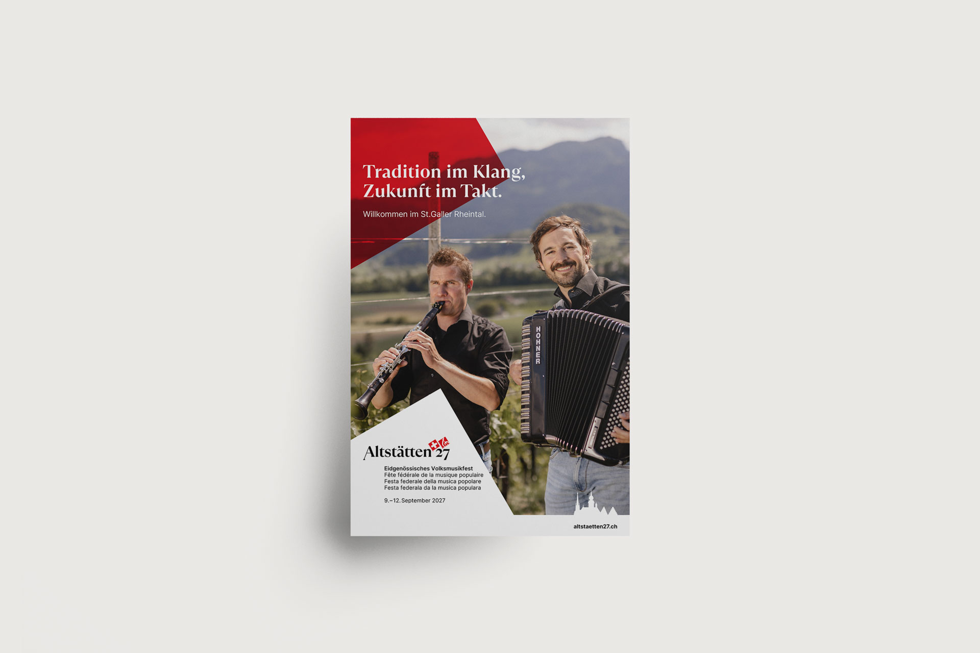 Branding für das Eidgenössische Volksmusikfest 2027. Keyvisual und Designsystem verbinden Tradition mit modernem Look. Ein Erscheinungsbild mit Wiedererkennung und Vorfreude.